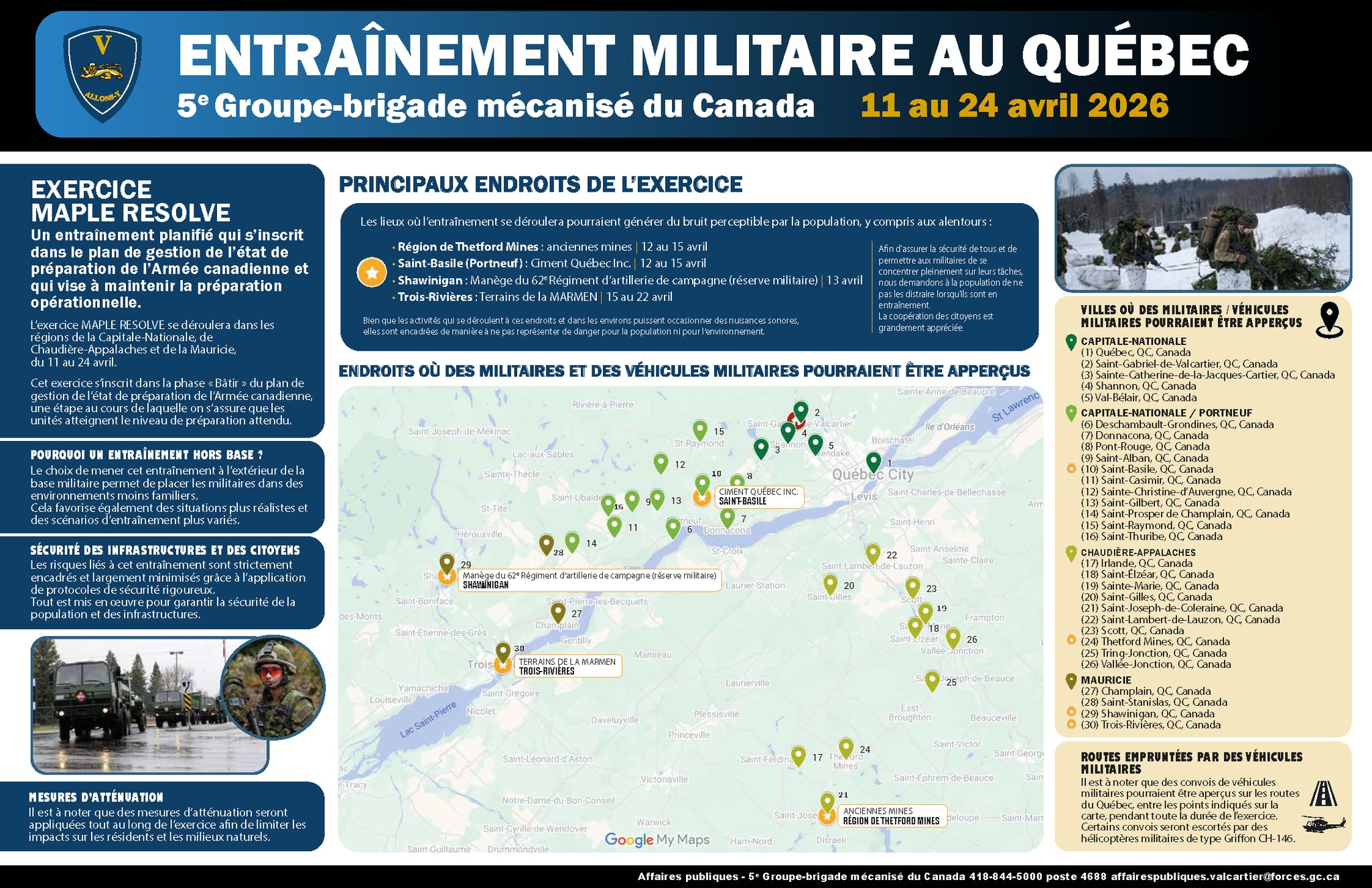 Dans le cadre de l'exercice militaire MAPLE RESOLVE, qui se déroule actuellement jusqu'au 24 avril, le 5e Groupe-brigade mécanisé du Canada sera de passage à Portneuf.