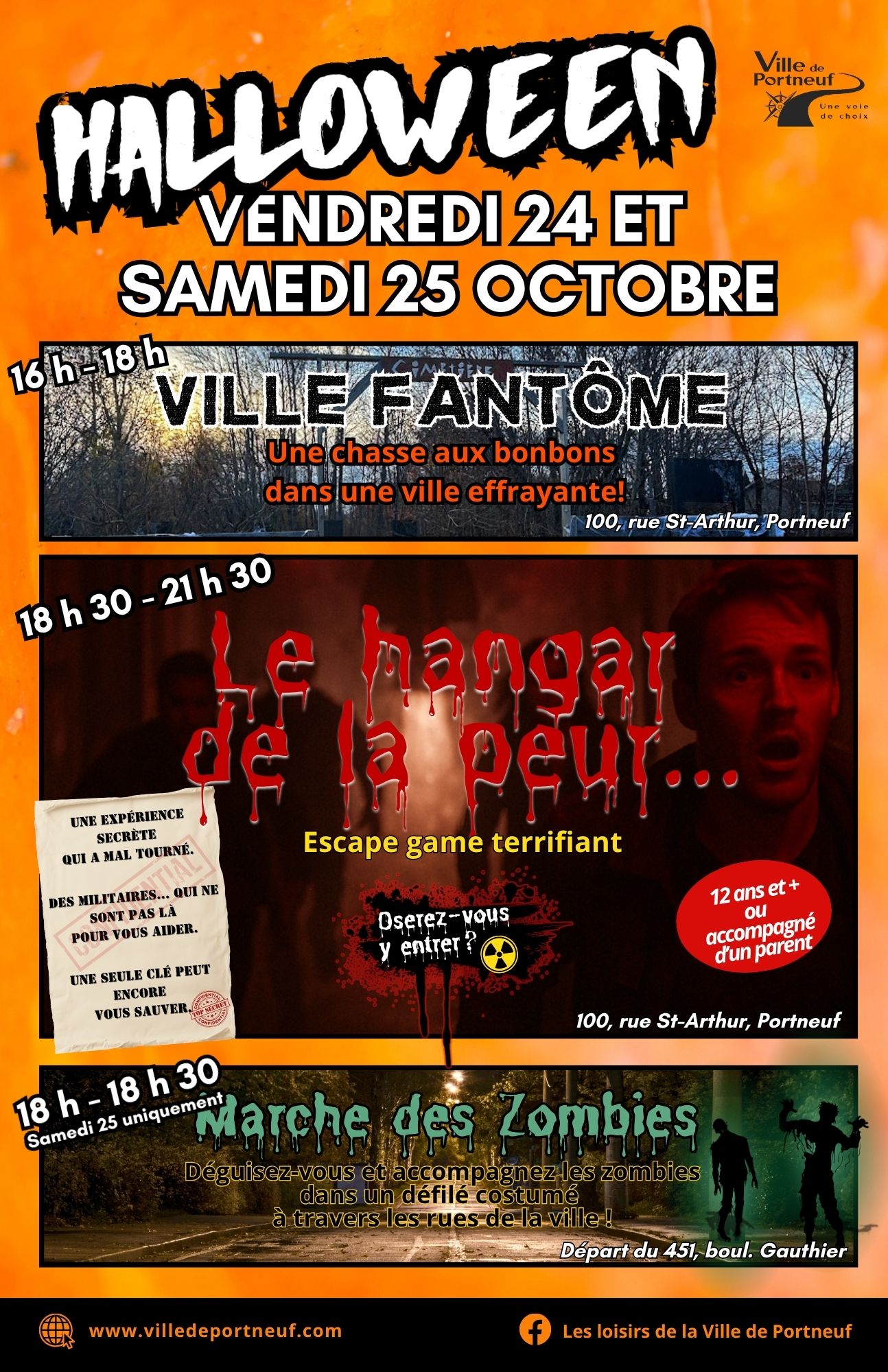 Dès 16 h, petits et grands pourront s'aventurer dans la Ville Fantôme et sa chasse aux bonbons effrayante. À 18 h 30, les portes du Hangar s'ouvriront...mais seulement pour les plus courageux de 12 ans et plus. Notez la date, préparez-vous...le danger rôde et plus de détails vous seront dévoilés très bientôt.